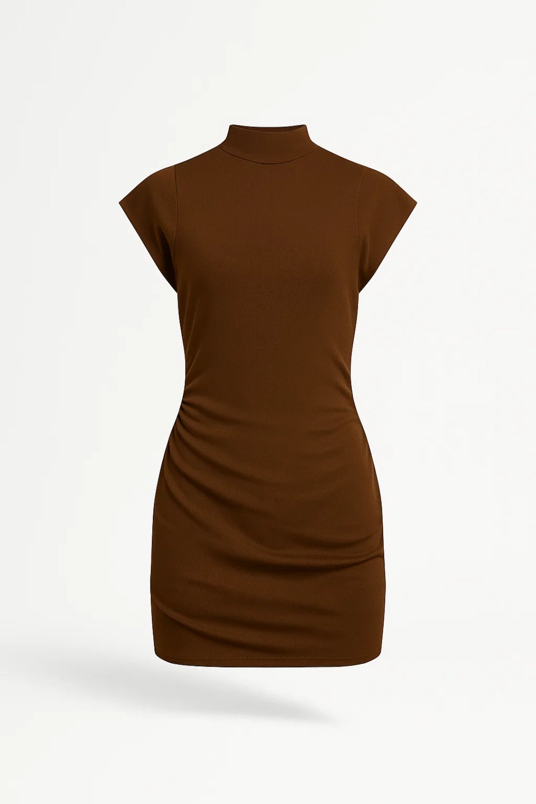 Dit aansluitende jurkje met hoge hals en gestructureerde mouwen creëert een moderne, elegante look. De rekbare stof omarmt het lichaam op een natuurlijke manier, terwijl de subtiele plooien aan de zijkant voor extra beweging zorgen. Perfect voor een avondje uit, op kantoor of een casual diner.