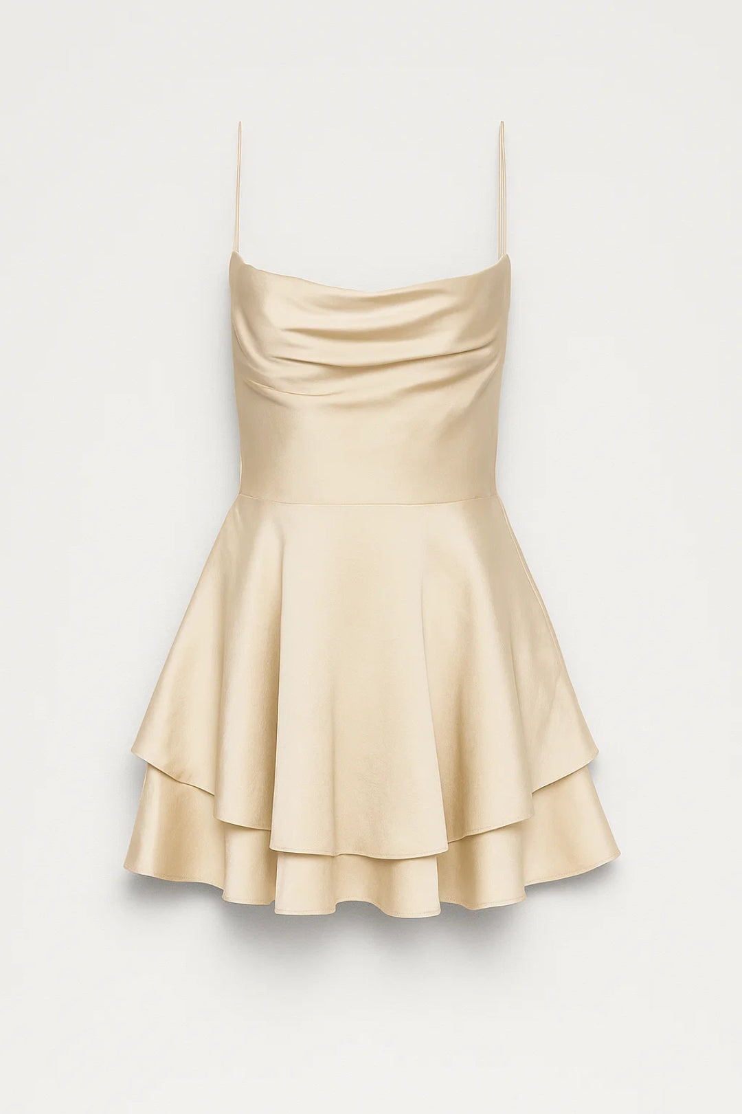 Dit jurkje met dunne bandjes en dubbele ruchelaag geeft een glamoureuze, moderne uitstraling. Het aansluitende lijfje accentueert het silhouet, terwijl de soepele, glanzende stof zorgt voor een elegante finish. Perfect voor diners, events of chique gelegenheden.