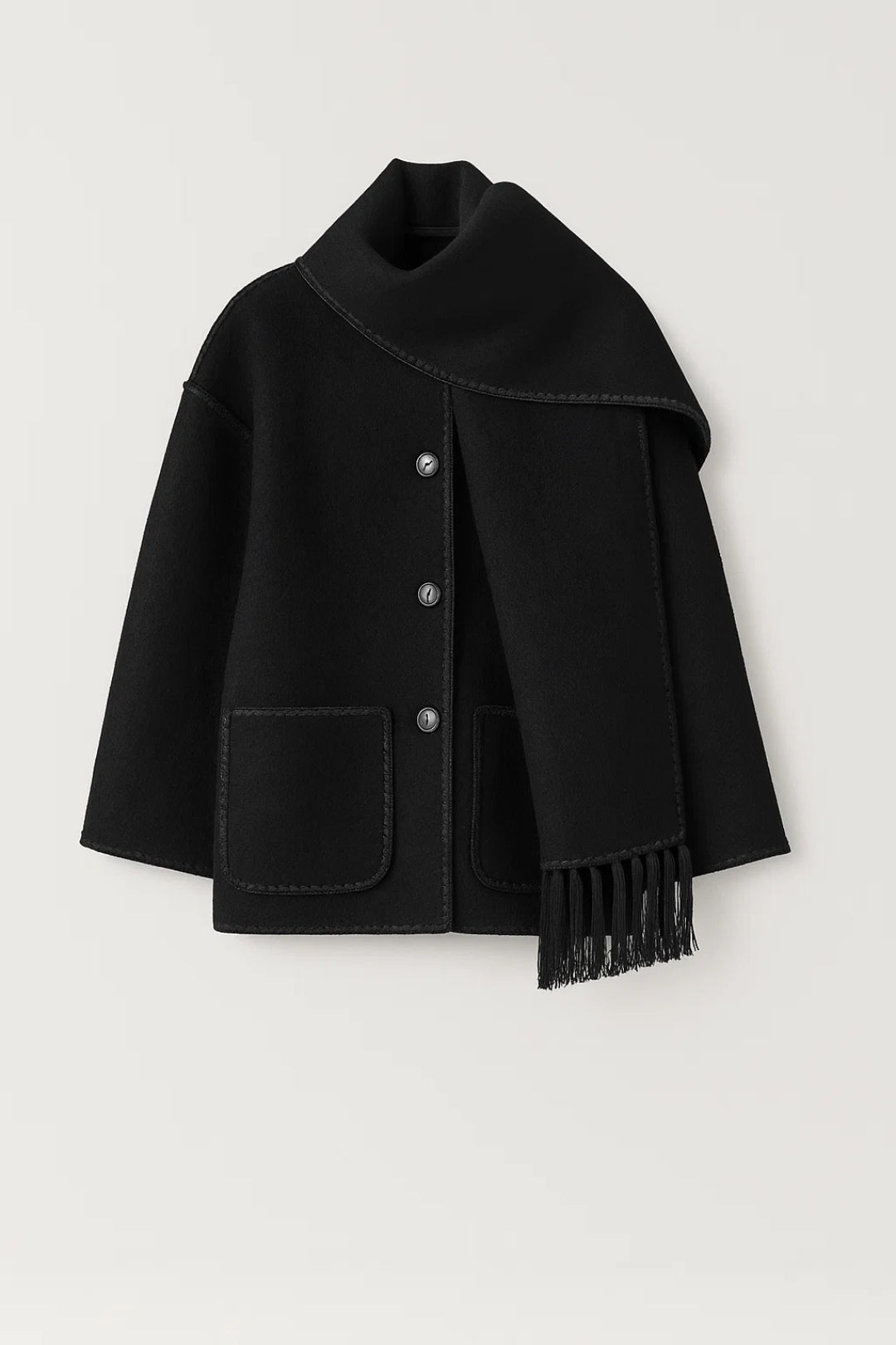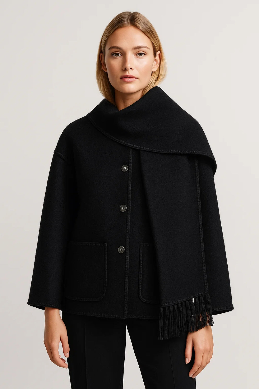 Deze korte jas combineert een klassieke knoopsluiting met een opvallend asymmetrisch sjaaldetail en elegante franjes. Perfect voor wie comfort wil zonder in te leveren op stijl – ideaal voor de overgang naar koudere dagen.